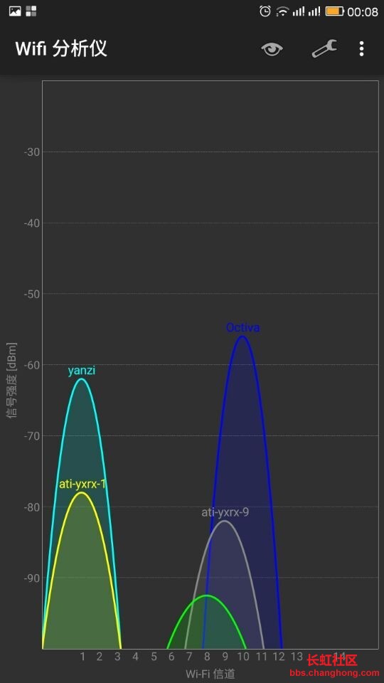在Android平台上我们能找到的最容易使用的工具就是WiFi Analyzer了。运行后将看到在你的区域中所有的无线网络概况,以及它们都在使用哪条通道。