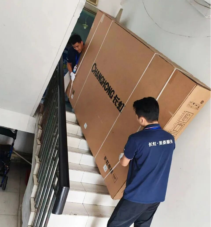 重庆江北区窦先生在长虹•美菱内购会购入百吋巨幕电视,却因电梯尺寸限制无法上楼。在服务现场的两位售后师傅果断选择步梯上楼,肩扛手抬,汗水浸透工装仍稳步前行,将电视安全送达。